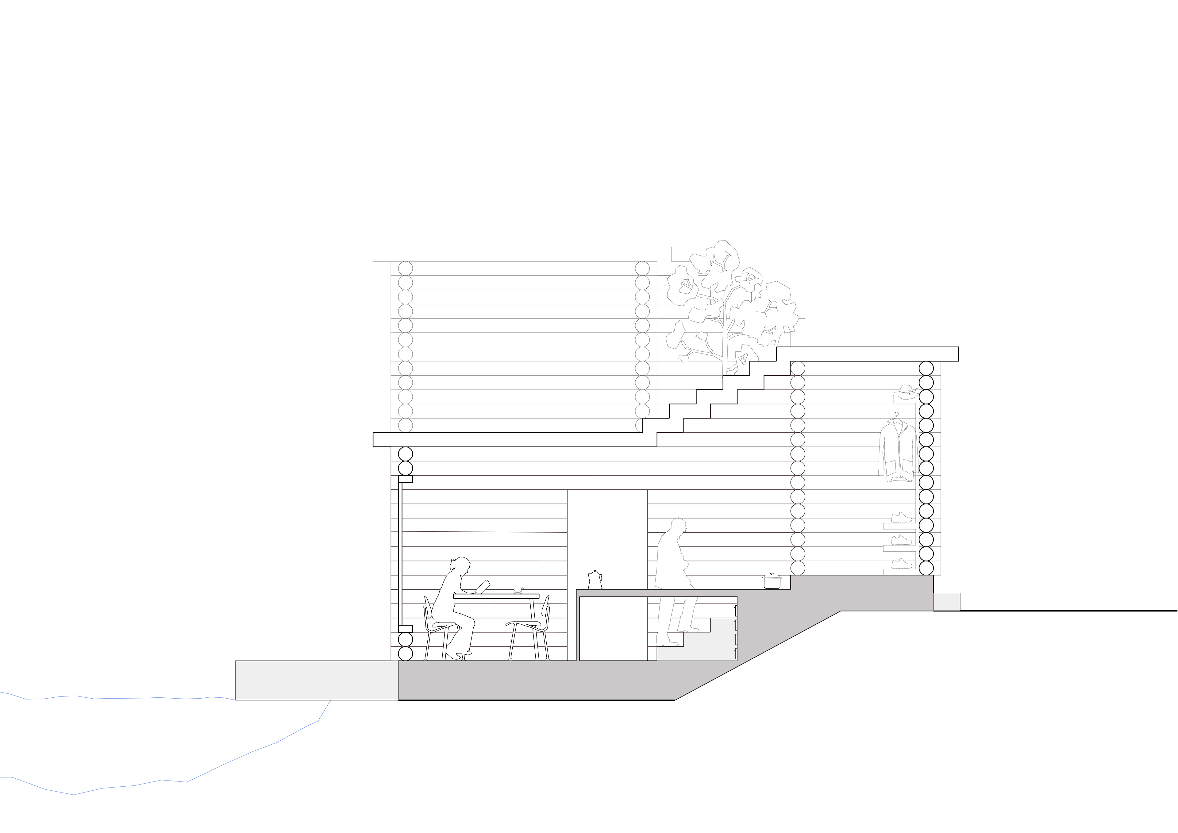 "Elvebredden" har en knekk med en helning på 30 grader. Tomten min er plassert ved en elv i Frankrike og er omringet av fjellkjeder. Elven renner rett nedenfor boligen. Bygningen er inspirert av terrenget på den tildelte tomten. Rommene følger formen nedover langs bakken, men også oppover i den samme graden.
