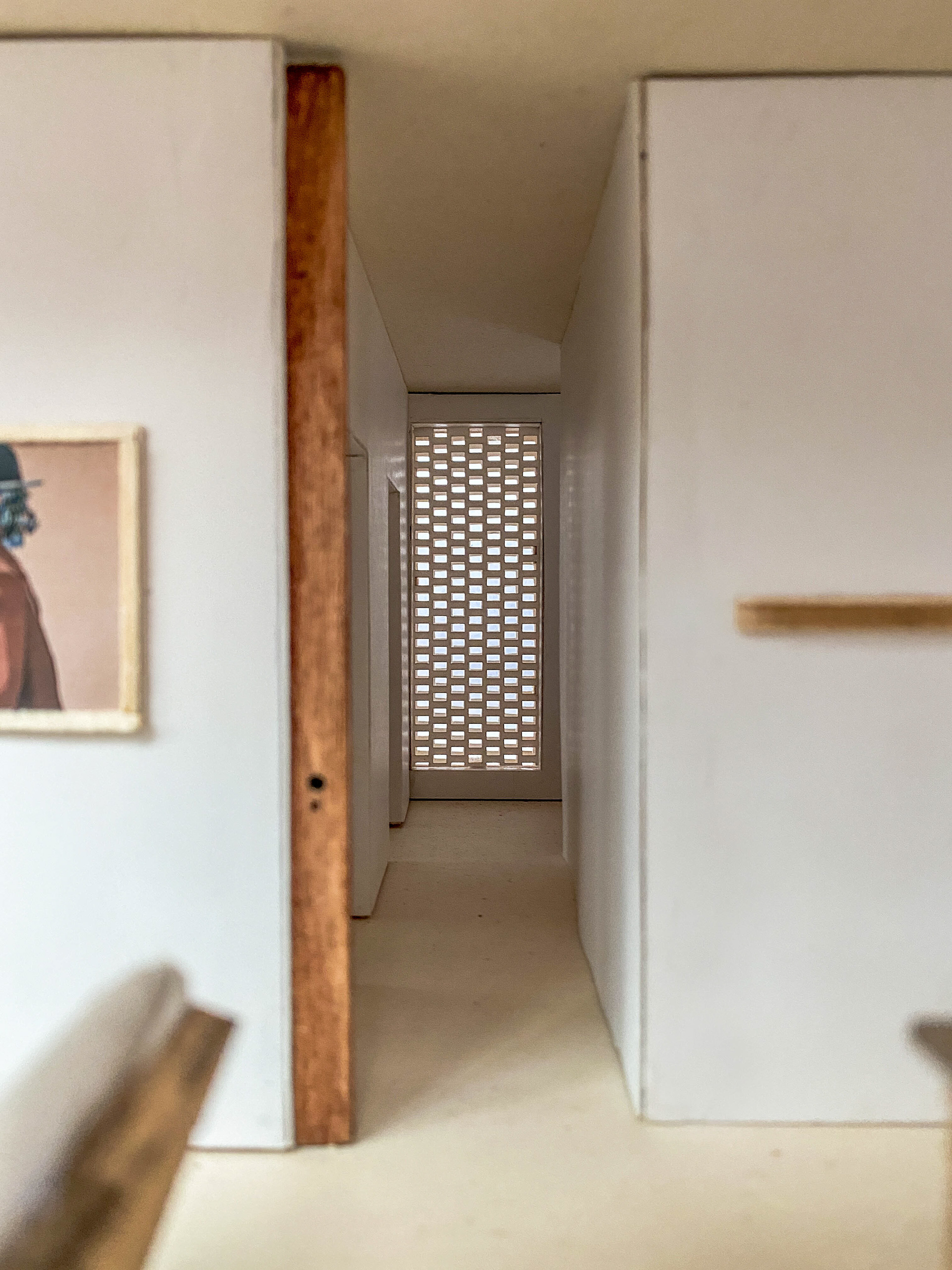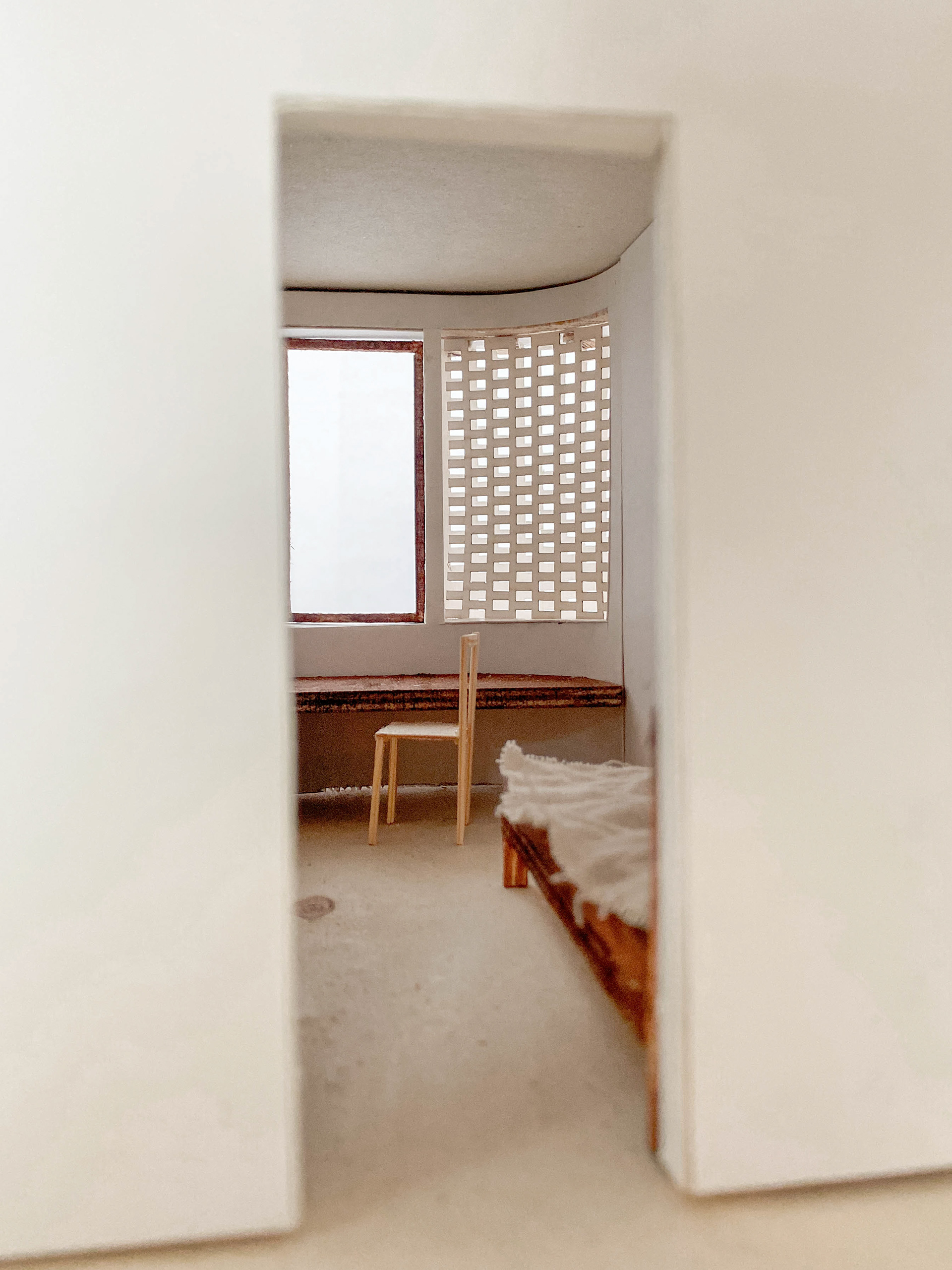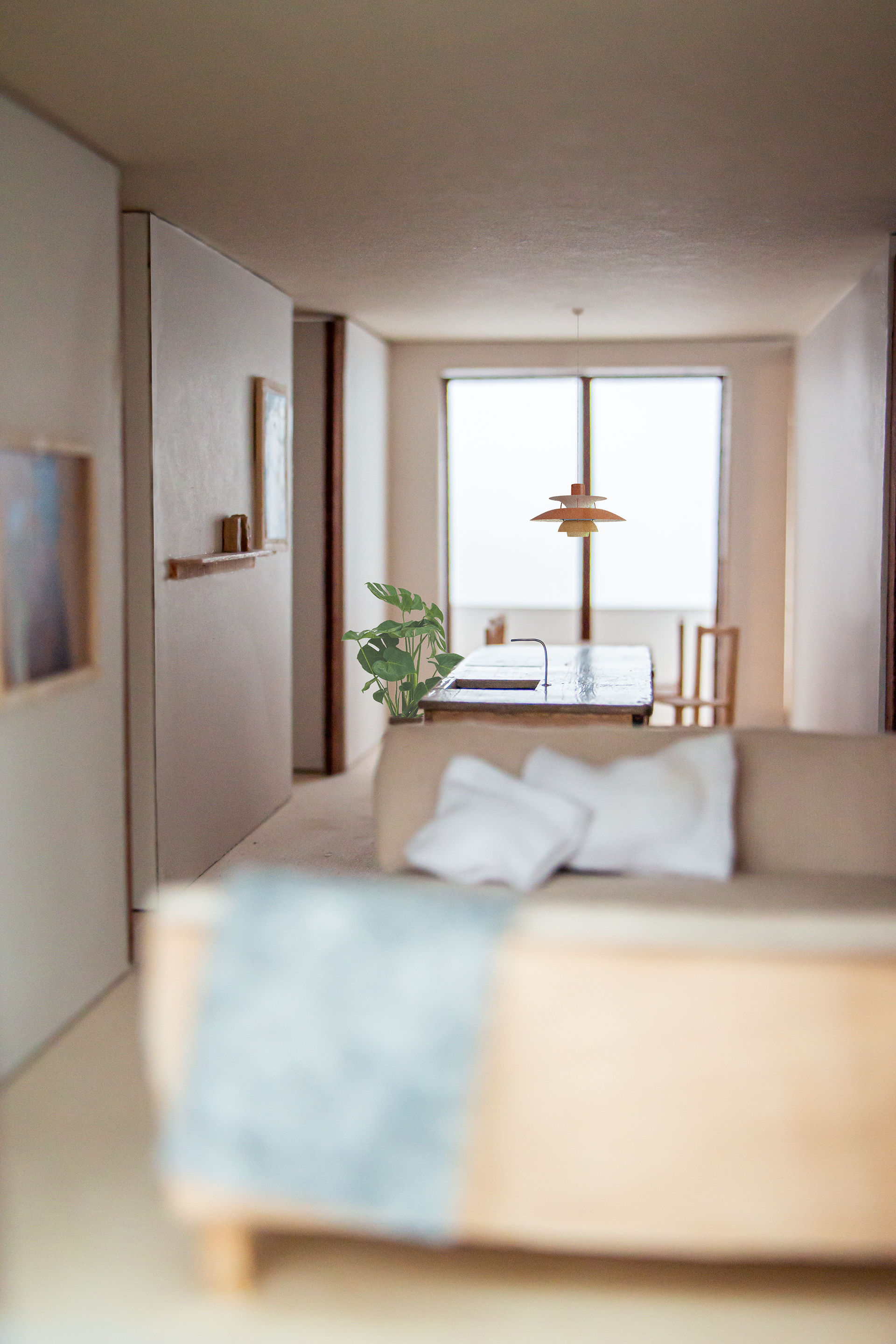 Interiørbilder fra modellen vi laget i skala 1:20. På bildene ser man hvilken effekt den perforerte teglsteinen gir for rommene. På bildene ser man også noen av de smarte løsningene vi har lagt inn, som blant annet en lang pult som deles mellom de to små soverommene. Man ser også skyvedørene i oppholdsrommet som kan brukes til å dele av rommet på flere ulike måter. Leiligheten er tilpasset familier som vil bo i byen, men fortsatt få plass til privatliv.