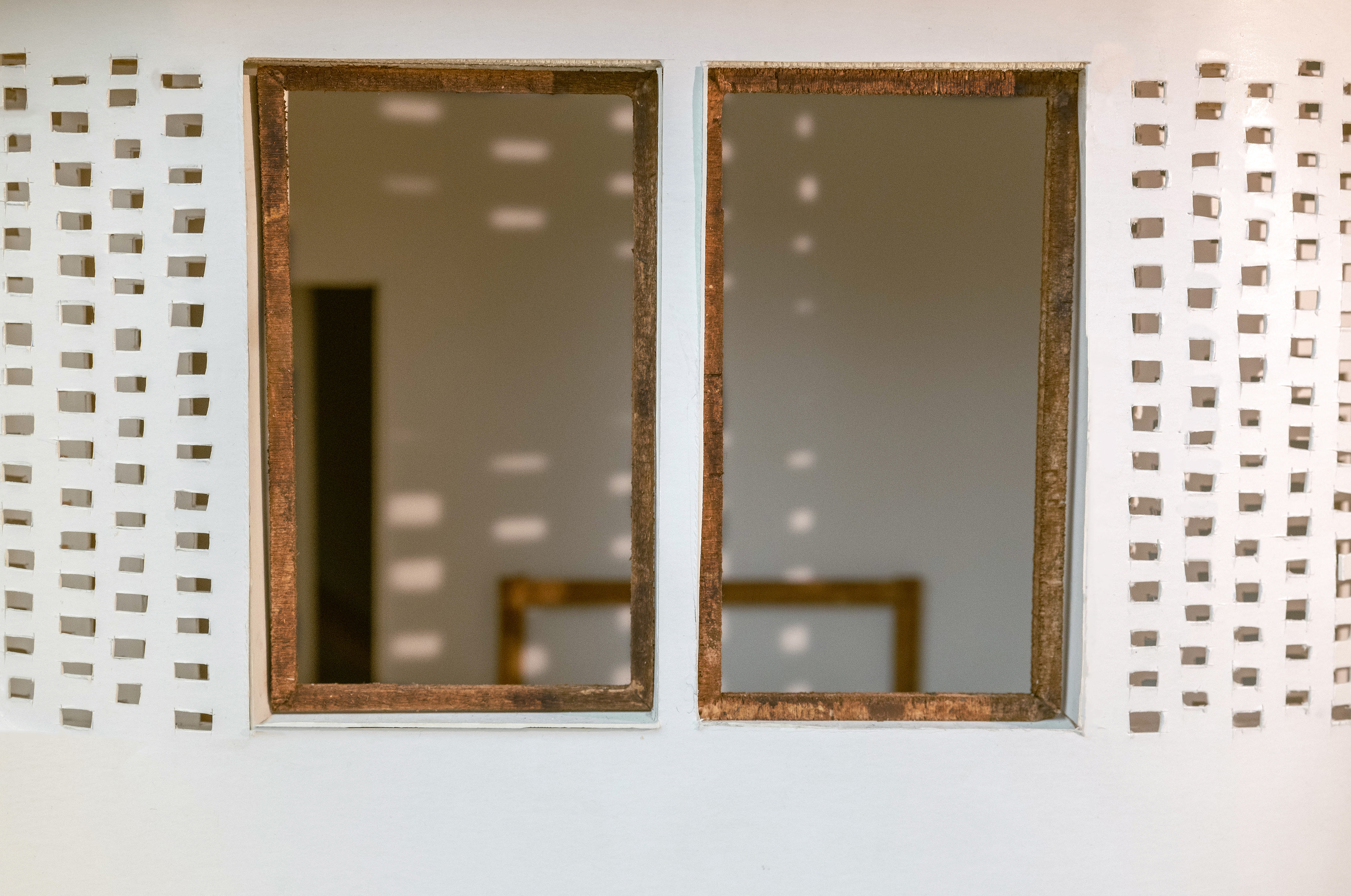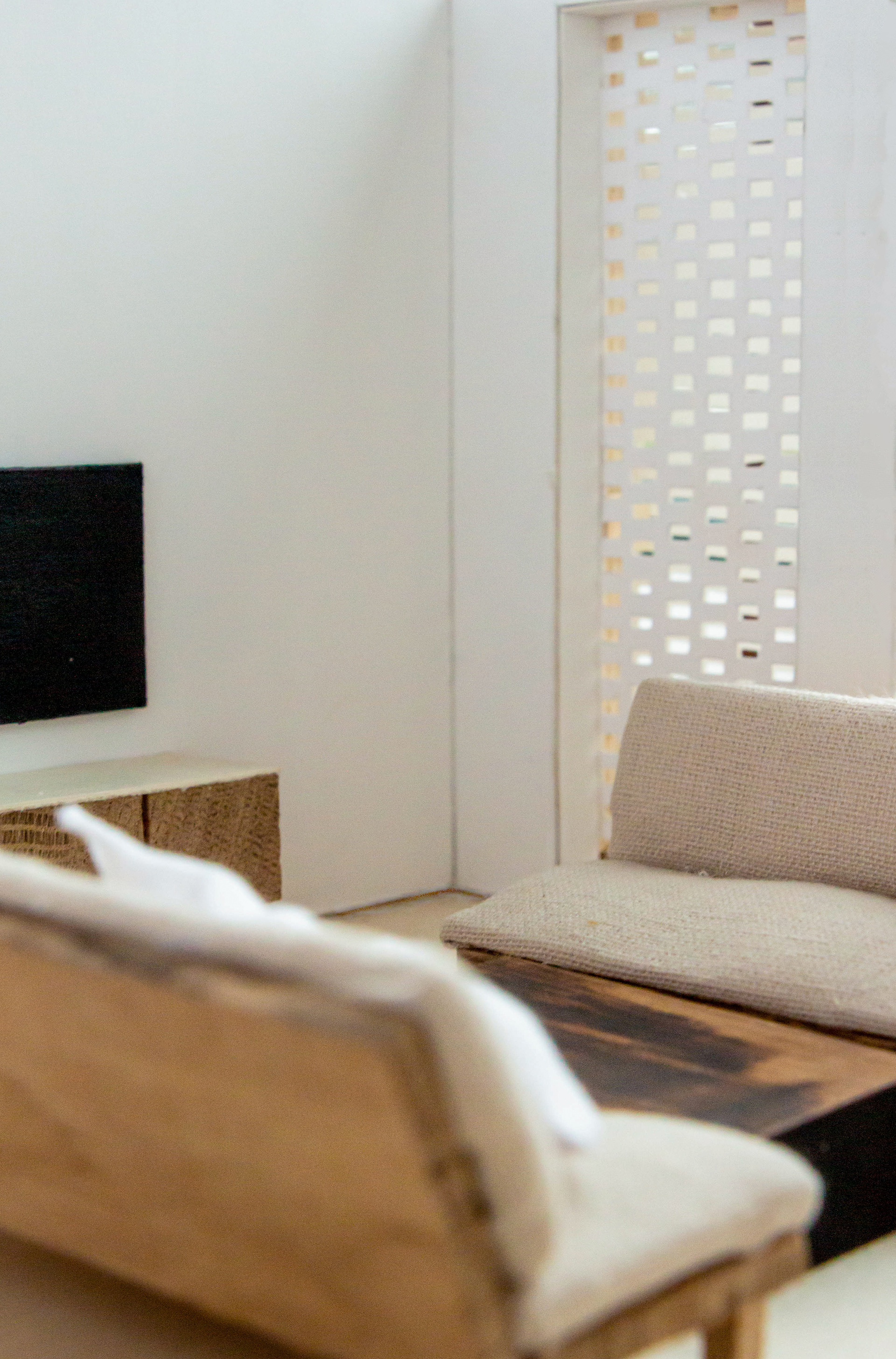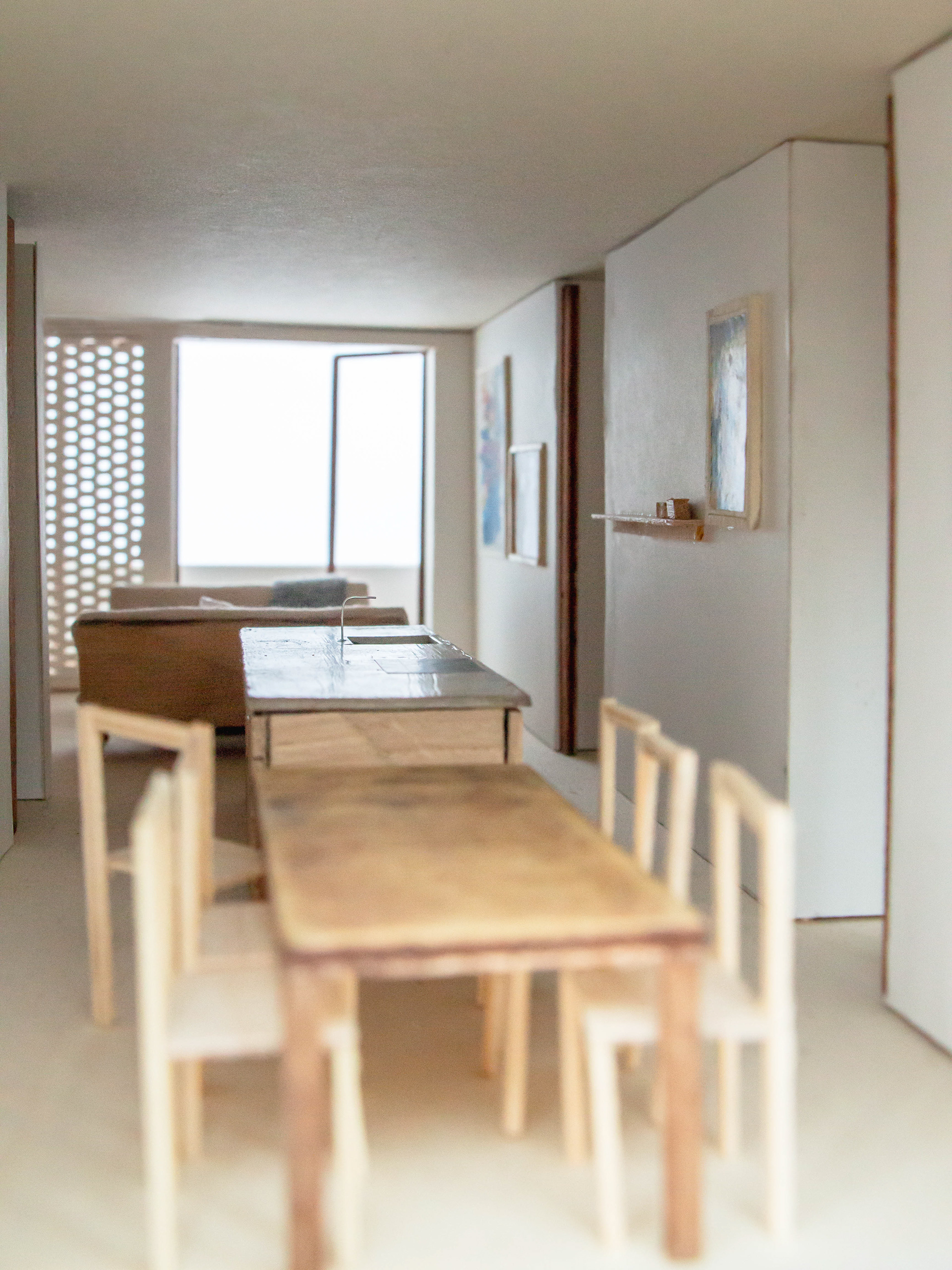 Interiørbilder fra modellen vi laget i skala 1:20. På bildene ser man hvilken effekt den perforerte teglsteinen gir for rommene. På bildene ser man også noen av de smarte løsningene vi har lagt inn, som blant annet en lang pult som deles mellom de to små soverommene. Man ser også skyvedørene i oppholdsrommet som kan brukes til å dele av rommet på flere ulike måter. Leiligheten er tilpasset familier som vil bo i byen, men fortsatt få plass til privatliv.