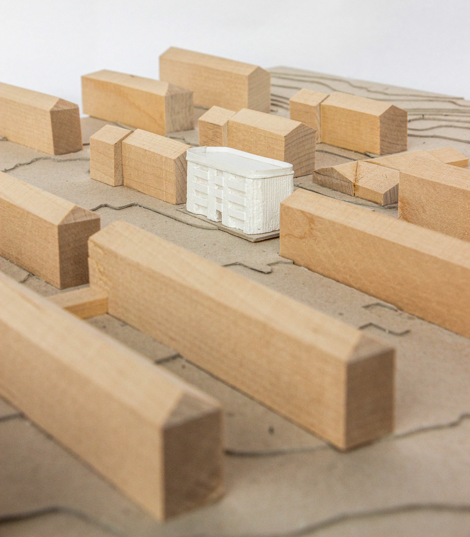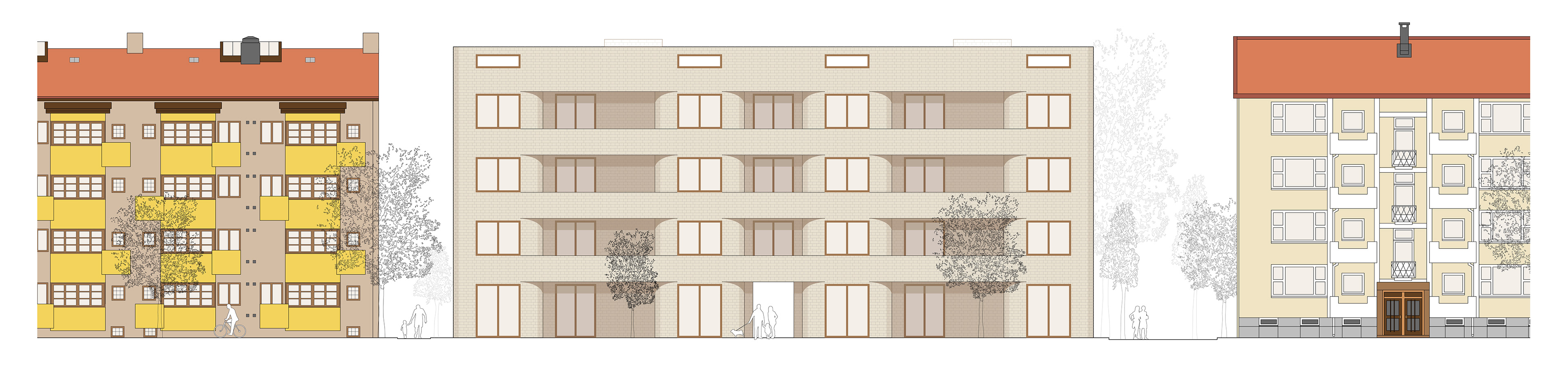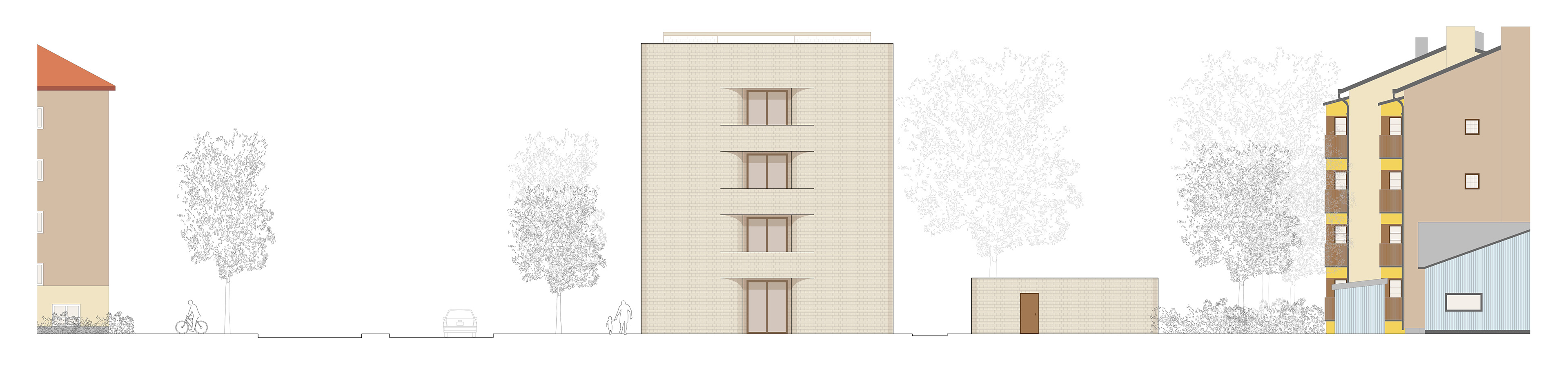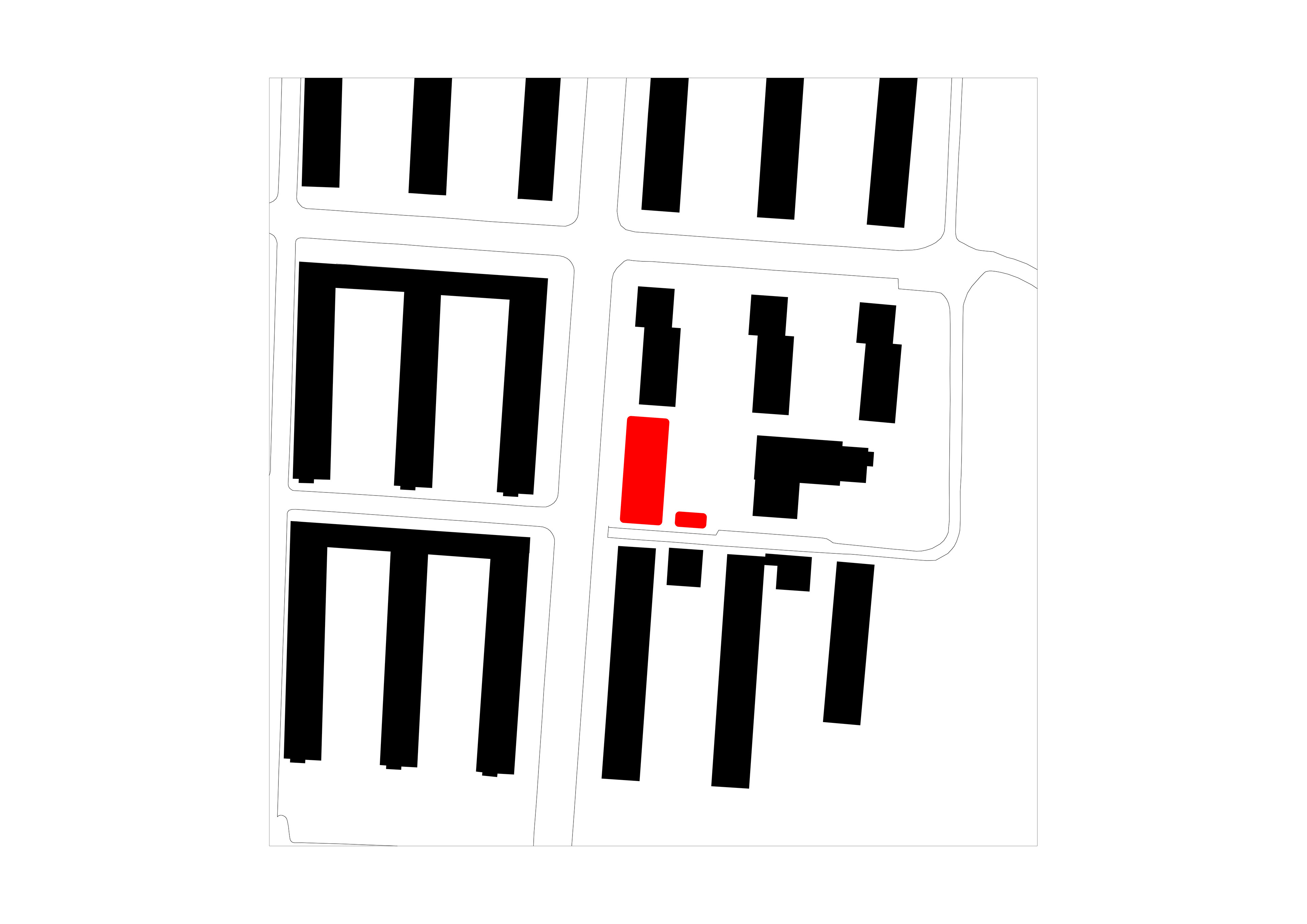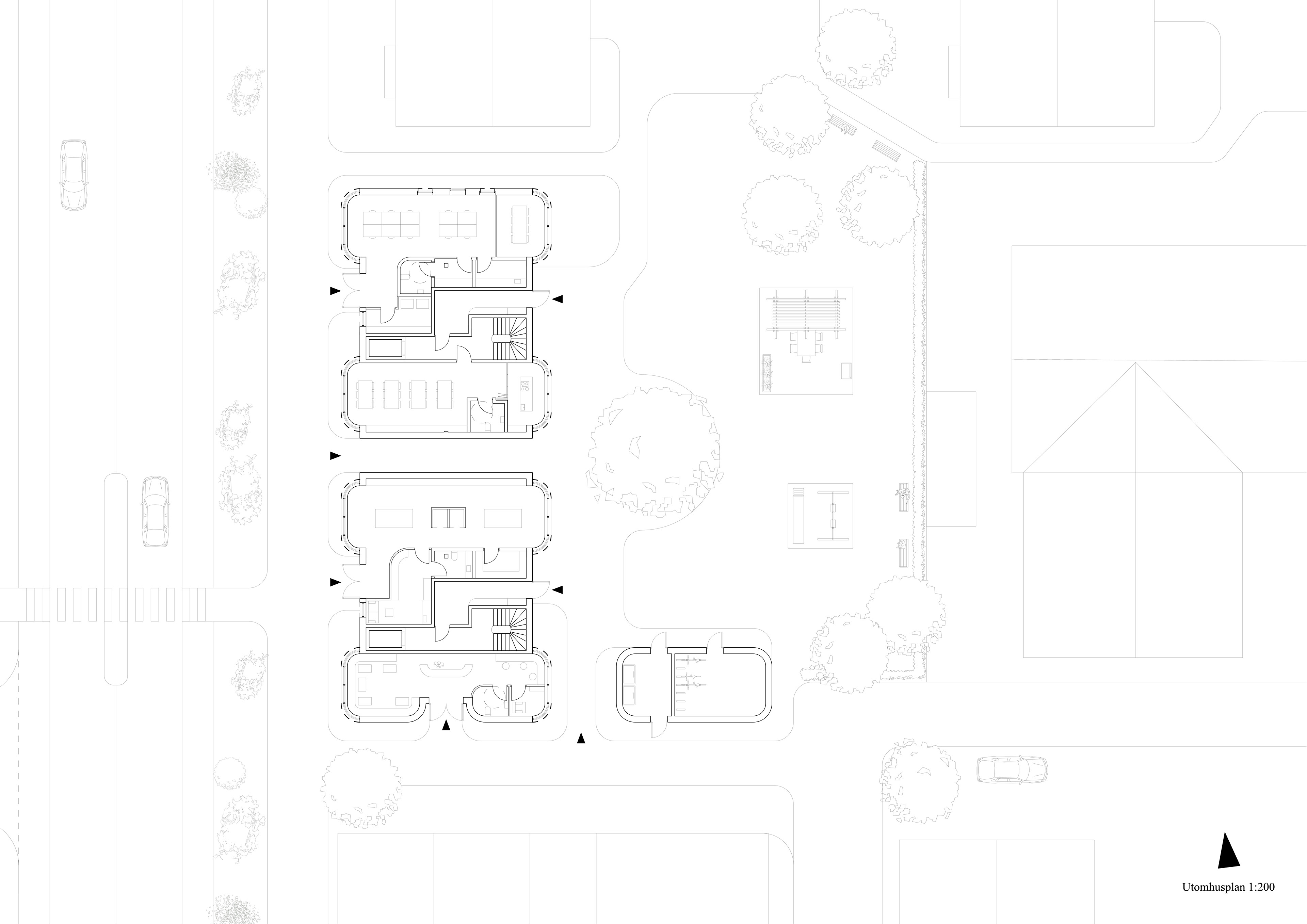 På den ene siden av tomten, mot vest, er det en trafikkert bilvei, mens på den andre siden, mot øst, befinner det seg en stor grønn skog med parkområder og barnehage. Bygget vårt gjenspeiler områdets lamellbebyggelse og ligger som et skille mellom de to ulike sonene. Bygningen tar hensyn til eksisterende lamellbebyggelse, følger aksen til de ytre lamellene og avgrenser bakgården med et lite tilbygg.