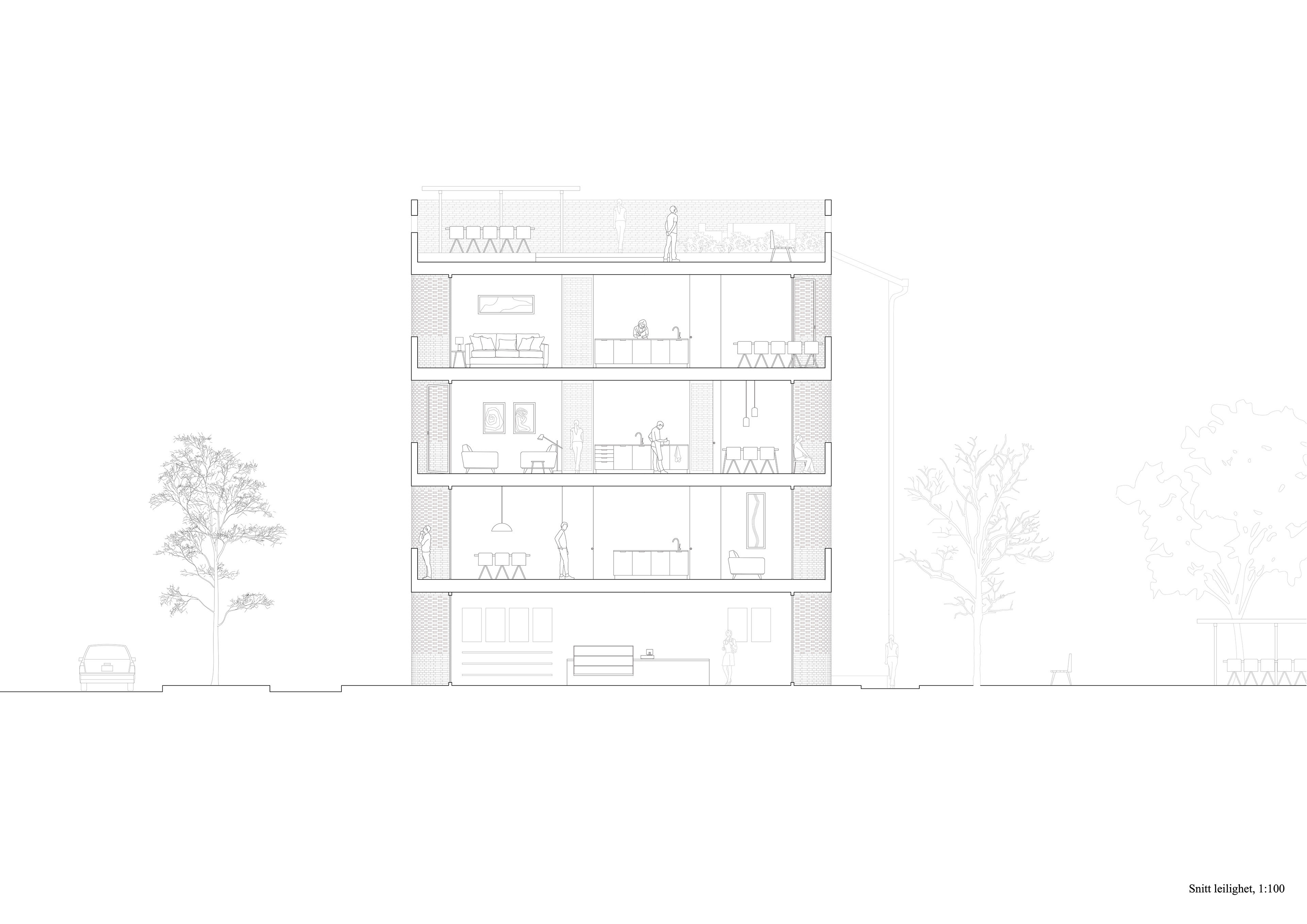 Her har vi snittet gjennom oppholdsrommet i de store endeleilighetene. Snittet viser blant annet livet i stua, og hvordan spisestuen kan utvides til balkongen. Kjøkkenet er plassert midt i rommet, noe som gjør veien kort til både spisebordet og til sofaen.