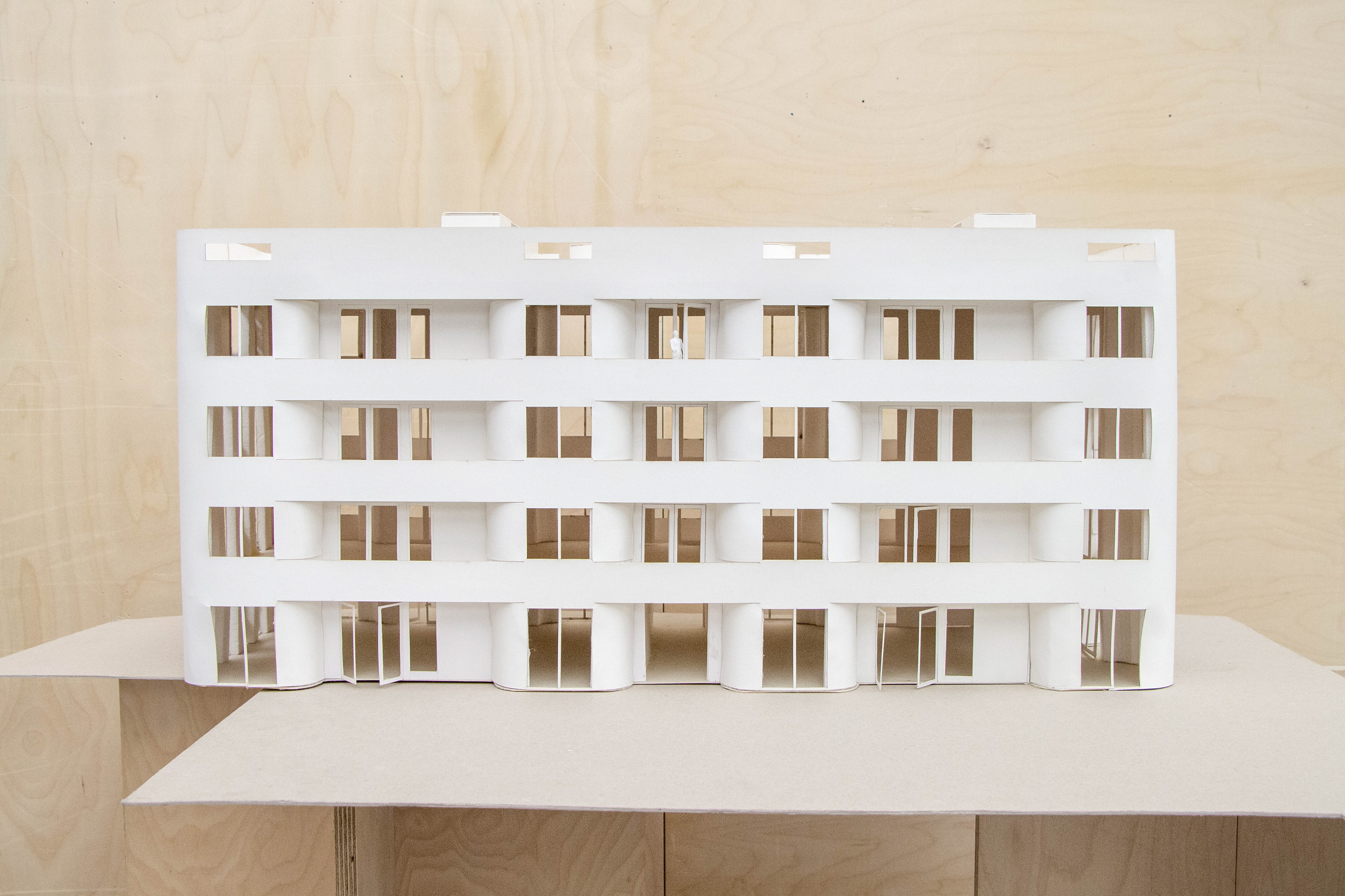Det var viktig for oss at balkongene skal være inntrukket for å beholde den rette fasaden samt å skape private balkonger med avskjerming fra trafikkstøy. Resultatet er en fasade som både kan oppleves flat og som står i stil med omkringliggende lamellbebyggelse, men også som en fasade med mer dybde og spenning.