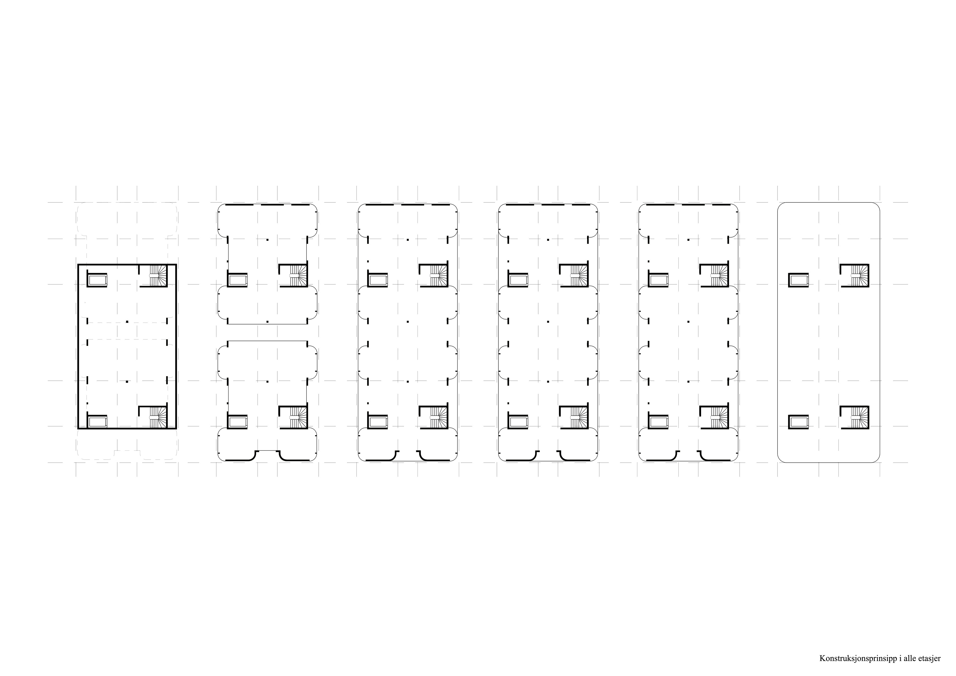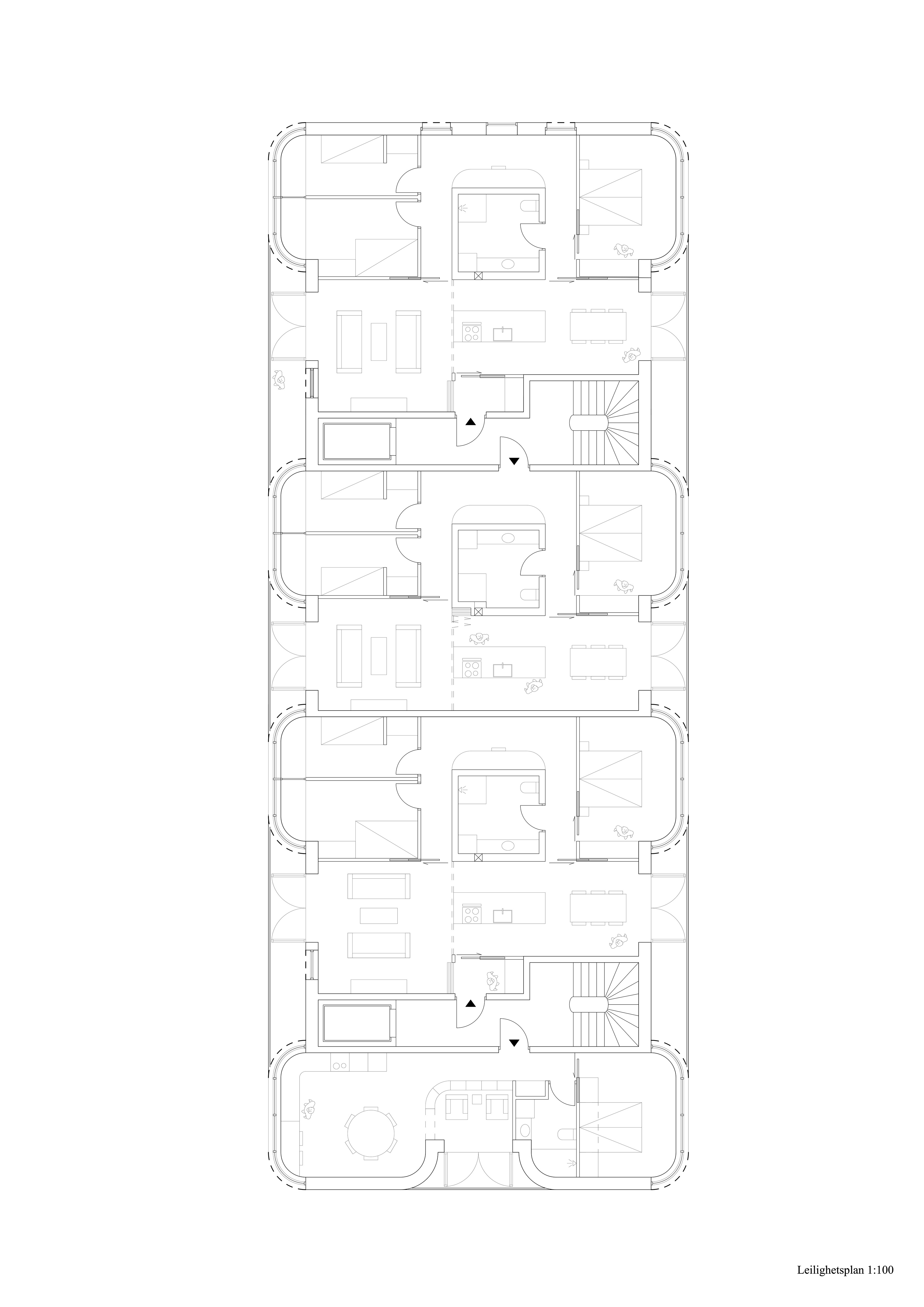Totalt inneholder bygget 12 leiligheter med 4 leiligheter per plan. Fire av leilighetene er fireromsleiligheter på ca. 90 kvm, og den ene endeleiligheten er toroms på ca. 45 kvm. Vi har lagt inn en WC-kjerne i midten av leilighetene for å frigi fasadeplass til soverommene. For å gjøre leilighetene mer fleksible har vi lagt inn foldedører i oppholdsrommet, og skyvedører rundt kjernen. Dette gjør det mulig å skape rom som kan håndtere ulike situasjoner.