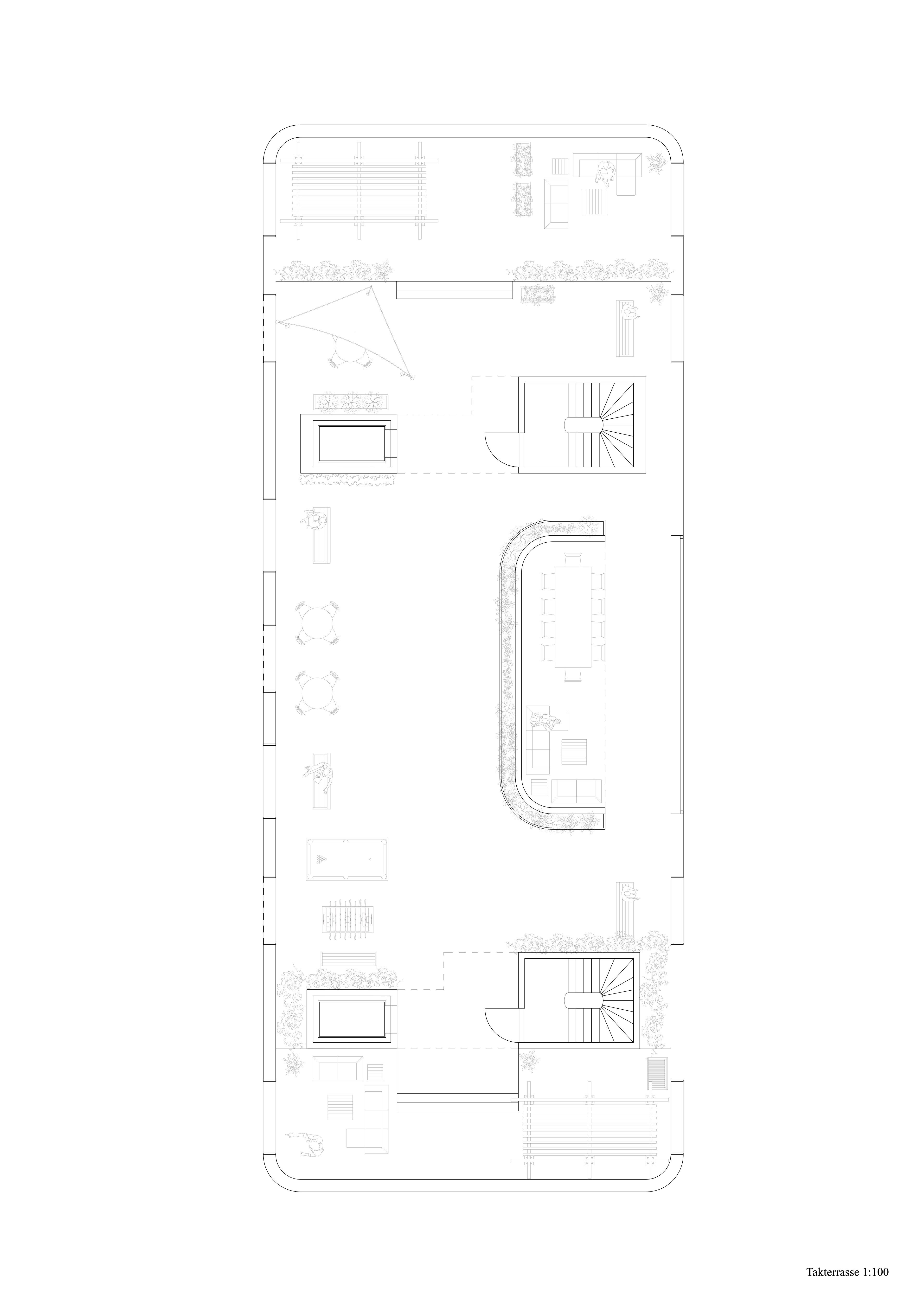 På toppen av bygget har vi lagt inn en takterrasse med opptrukne vegger. Tanken er at dette skal bli et felles utendørs oppholdsrom for beboerne som er mer privat og har andre kvaliteter enn balkongene, bakgården og parken. Takterrasse har både små private soner og store soner for sosialisering med naboene. Mot øst har vi trukket fasadeveggen innover for å skape en sone med utsikt mot den grønne skogen.