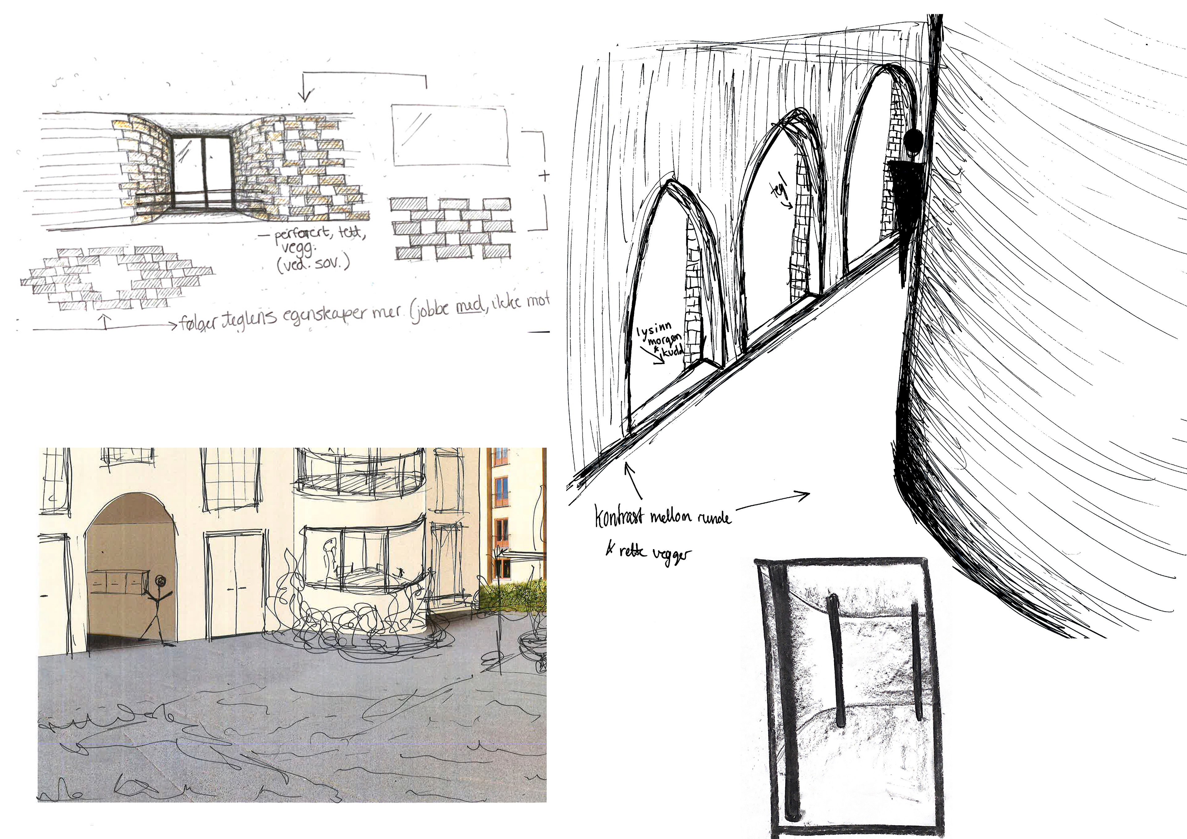 Dette er skisser fra tidlig ide-fase der vi blant annet har vært inspirert av buen, og måten den kan være med og skape spennende inne- og uterom.
