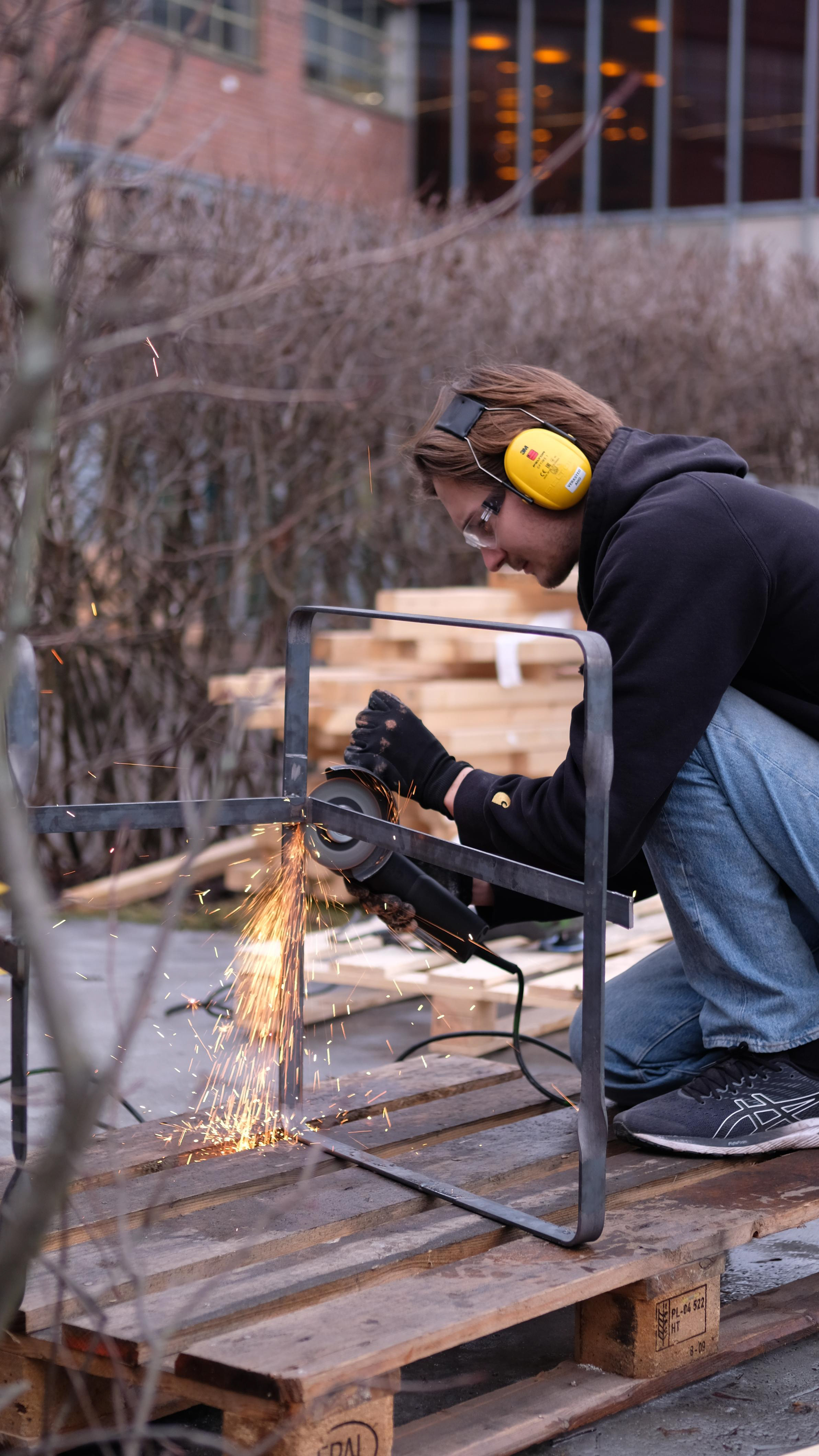 Under workshop hadde vi kun lov til å bruke stål, men i ettertid har det blitt montert en treplate som sitteplate.
