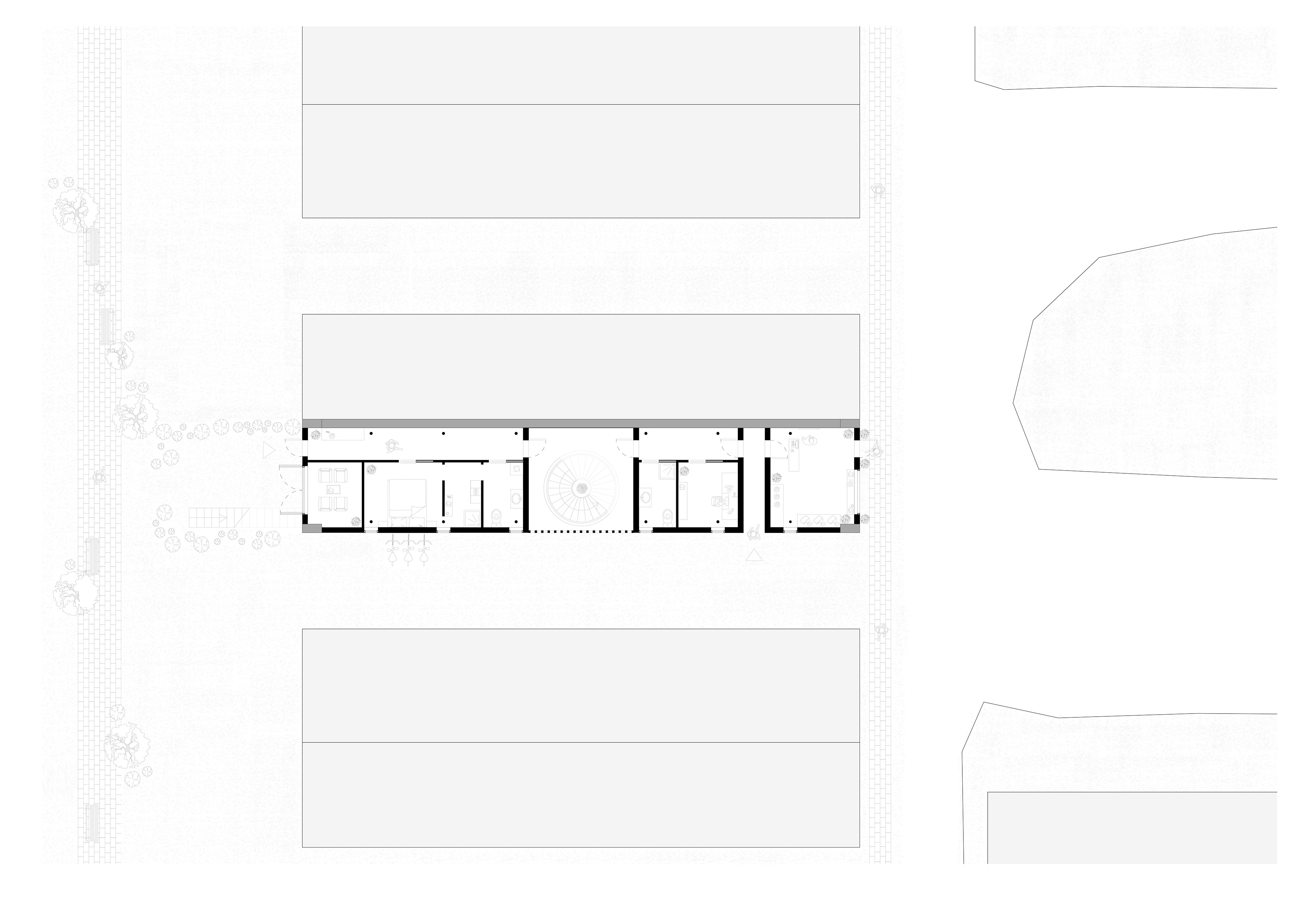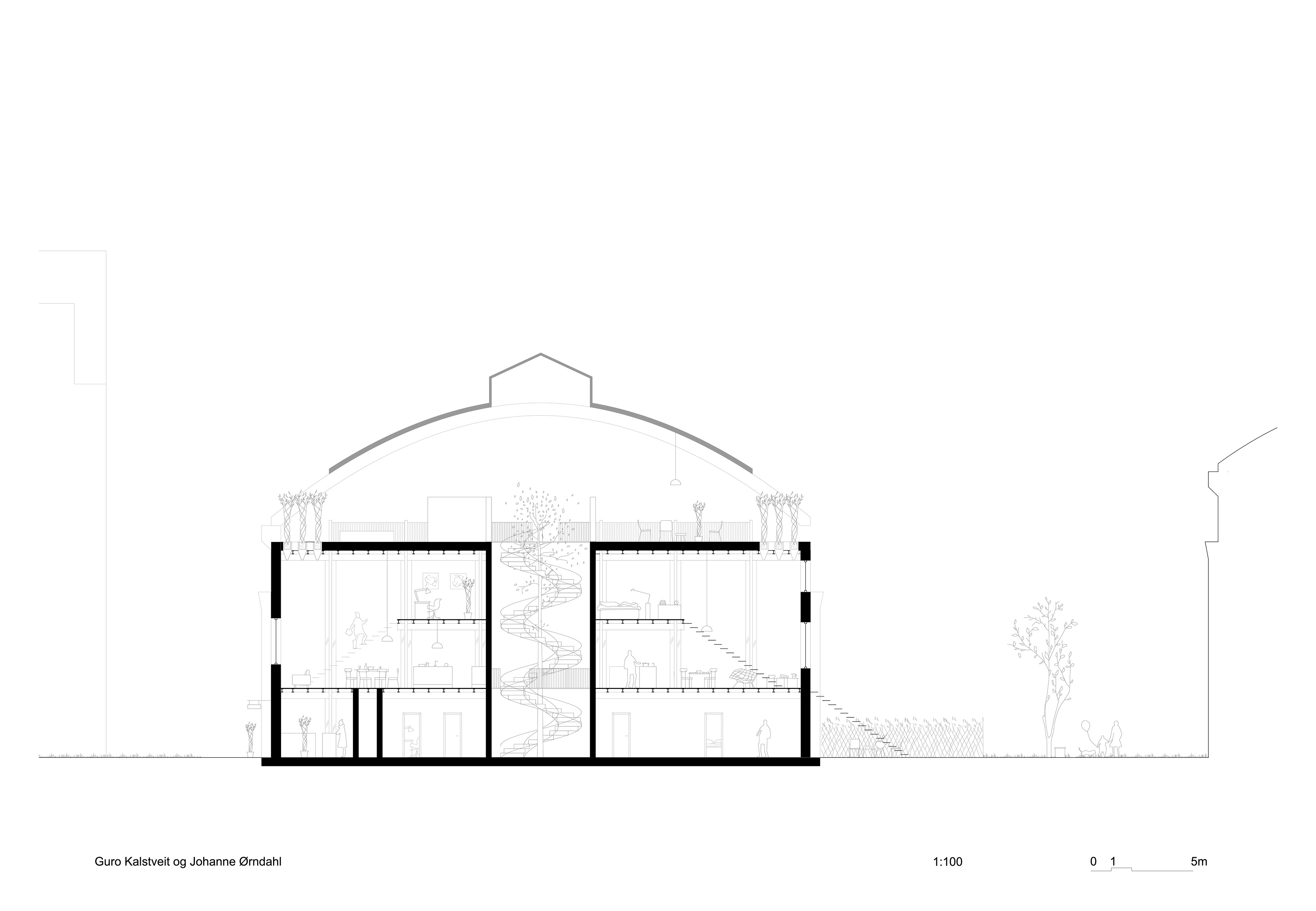 Oppgaven: Dette var et transformasjonsprosjekt der vi skulle tegne en bolig for to husholdninger som skulle har et areal for felles benyttelse. Innenfor disse føringene skulle vi selv definere og formulere et mer spesifikt program. Boligen skulle tegnes inn i en eksisterende betongkonstruksjon på Ensjø i Oslo (Gladengveien 8).