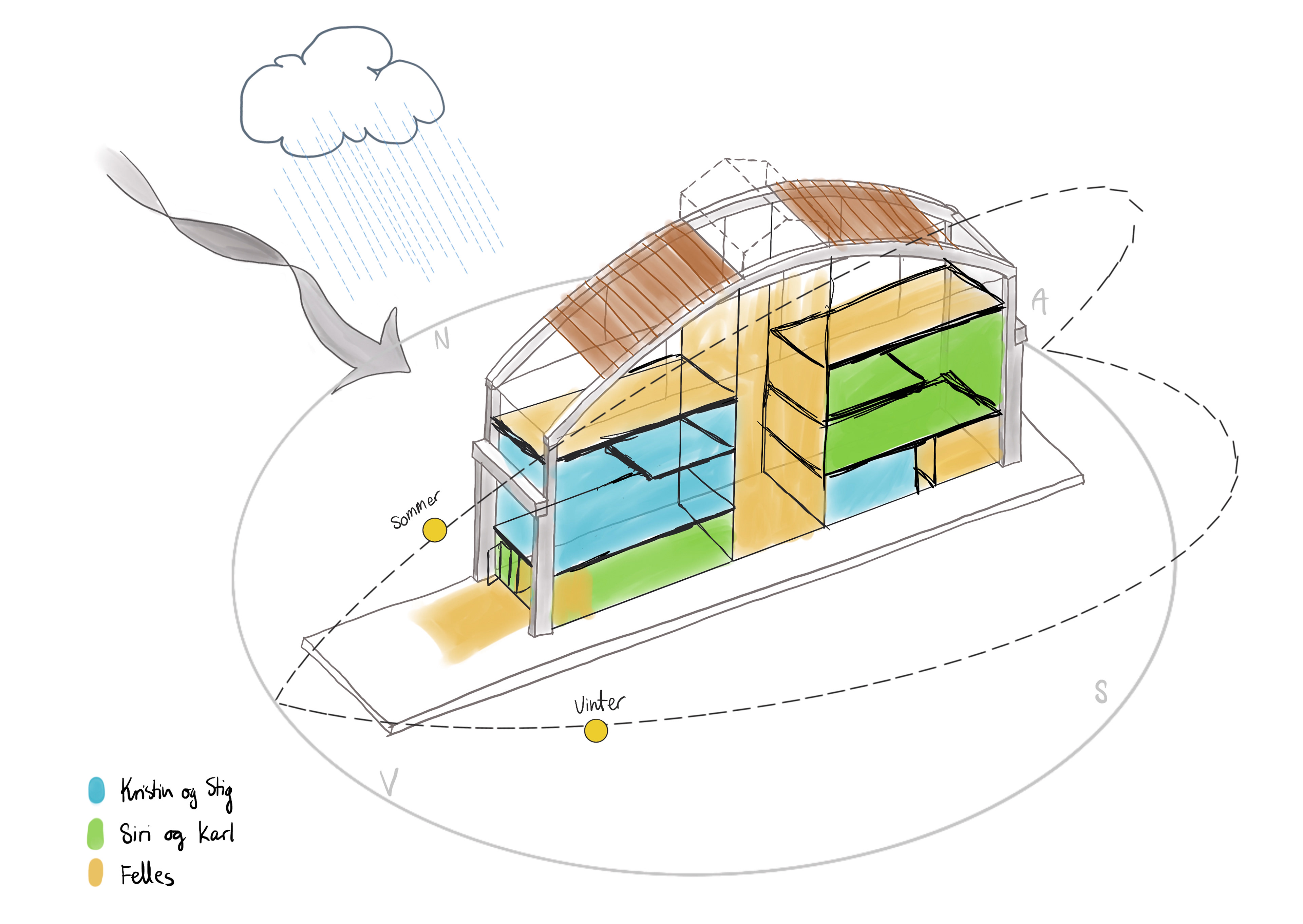Et skissediagram som viser de ulike værforholdene på tomten. Det andre diagrammet viser også fordelingen mellom de ulike husholdningene.