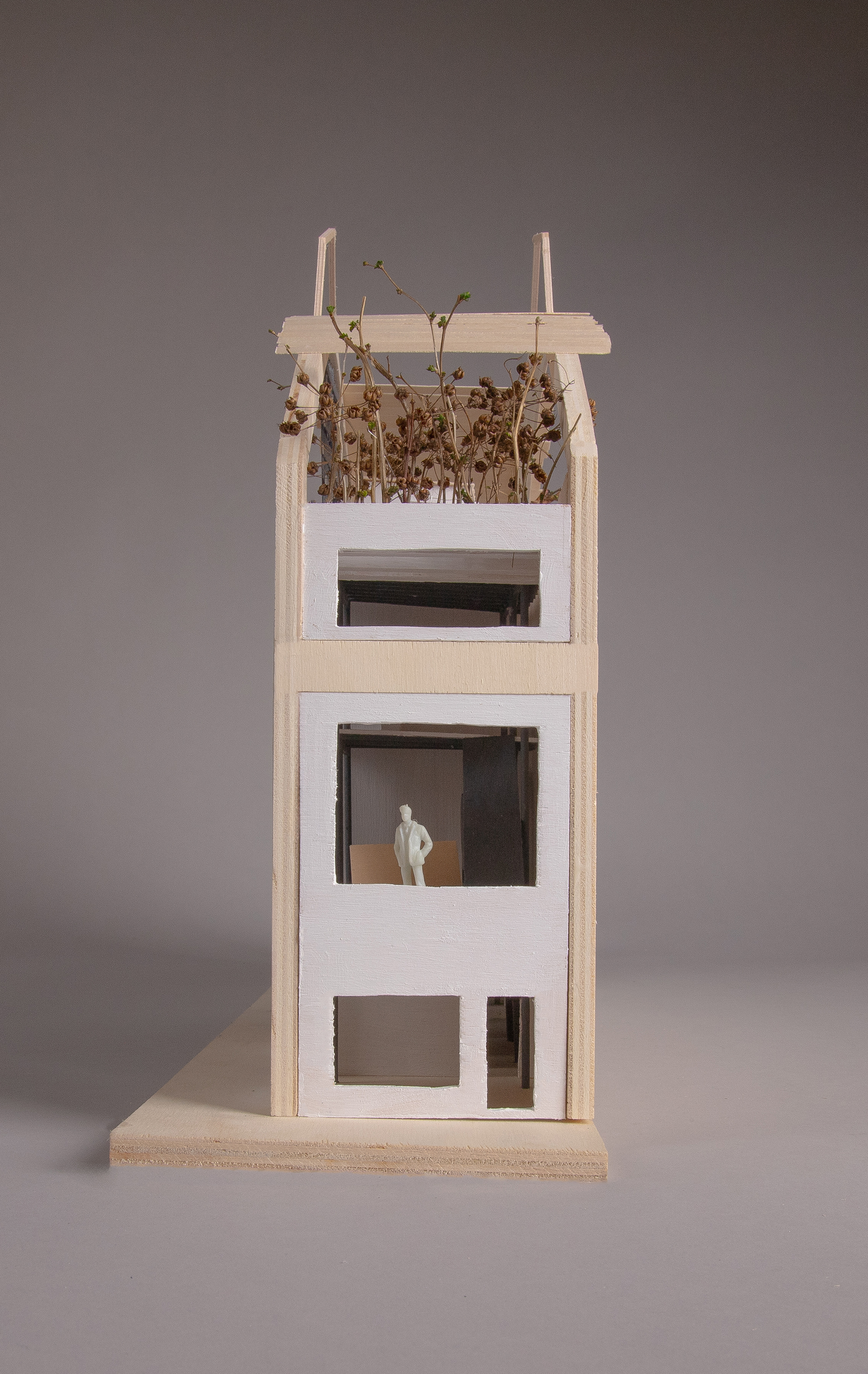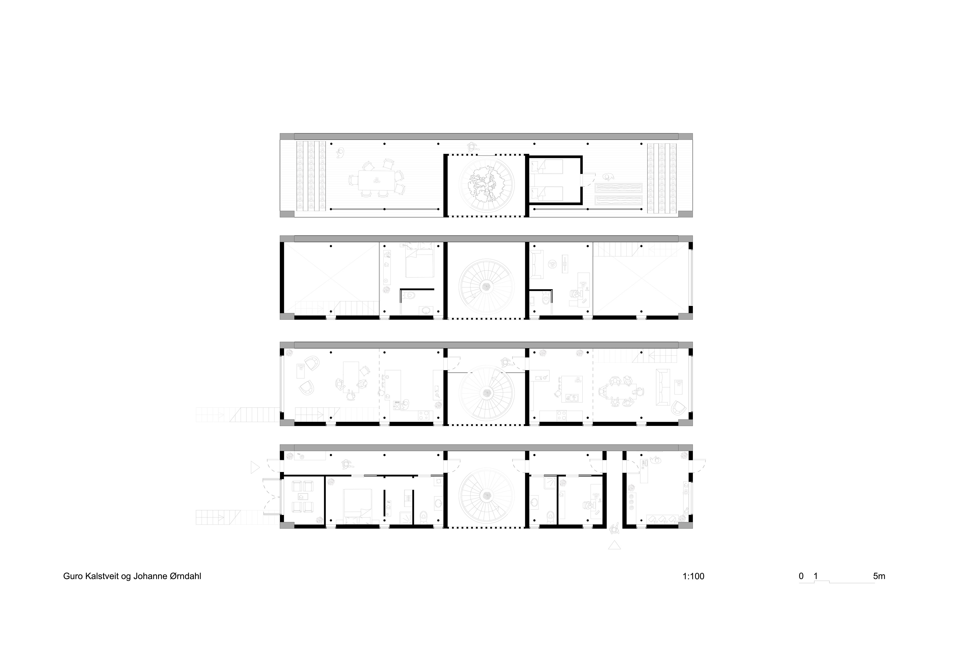 Planer for de ulike etasjene i townhouset. Førsteetasje benyttes hovedsaklig til soverom og bad. Halve førsteetasjen til paret benyttes som utsalgssted for pilflettingen deres. I andre etasje har de hver sitt kjøkken og stue. Der har de også en mesanene med soverom og toalett. På toppen er det en felles takterrasse.